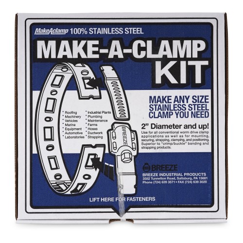 Breeze Make-A-Clamp le ofrece un sistema de abrazadera de mantenimiento total reutilizable en un kit, que consta de un rollo continuo de bandas de acero inoxidable y sujetadores de conjunto de engranaje helicoidal ajustables de acero inoxidable. Es imprescindible para cualquier persona que pueda encontrar requisitos para abrazaderas grandes de diferentes tamaños. Simplemente cortando un trozo de banda de un rollo continuo, puede fabricar abrazaderas de tornillo sin fin de cualquier tamaño, 100 % de acero inoxidable. Superior y más versátil que los productos de flejado y flejado “engarzados/abrochados”.