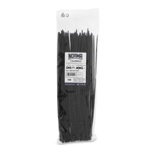 Variante: Cable Tie 3.5 x 290 Banda ancha: 3,5 milímetros Longitud: 290 milímetros Diámetro mínimo: 1 milímetro Diámetro máximo: 80mm Resistencia a la tracción: 13 kilos Material corto: PA 66 Material largo: Poliamida 66 Nombre de la pieza del material 1: Banda Nombre de la pieza del material 1 material: Poliamida 66